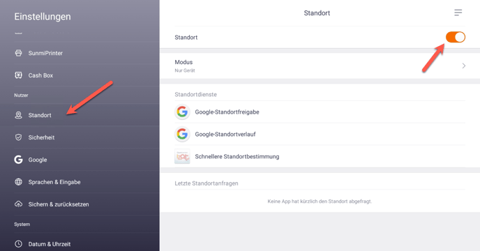 Damit die Sunmi-App den Drucker erkennen kann, muss auf dem Gerät der Standort aktiviert sein.