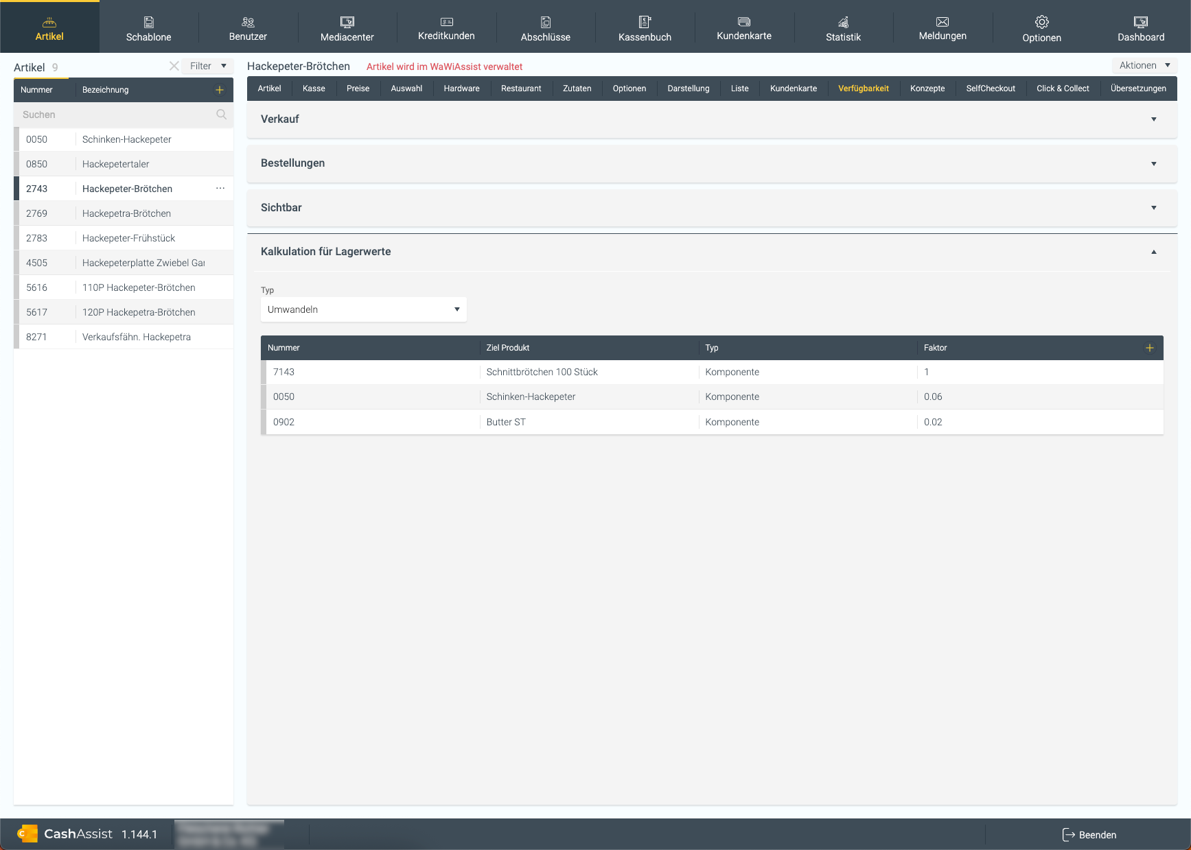 Nun richten wir das System so ein, dass jedesmal wenn ein Hackepter-Brötchen verkauft wird, auch 60g beim Schinken-Hackepeter automatisch abgezogen werden. Dazu navigieren wir zu Artikel - Verfügbarkeit - Kalkulation für Lagerwerte.