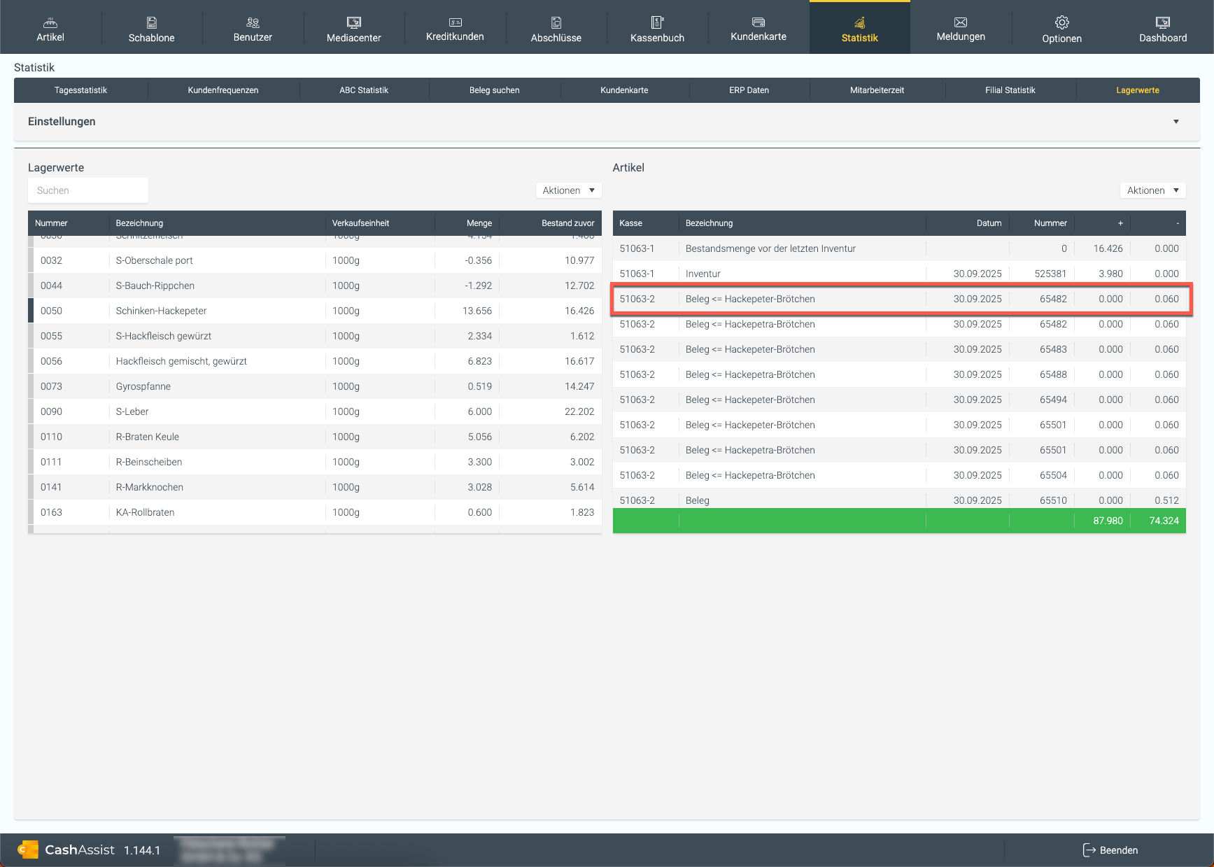 Sie sehen hier den Eintrag "Schinken-Hackepeter" mit Faktor 0.06. Das hat nun in der Berechnung der Lagerwerte folgenden Effekt