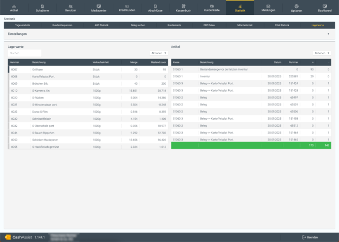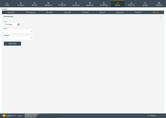 Unter der Statistik findet man den Reiter "Lagerwerte". Als Vorselektion können 3 Parameter gewählt werden.