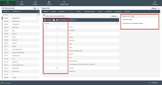 Markiere die entsprechenden Felder, wenn dein Rohstoff laut Lieferant oder Etikett einen dieser Stoffe enthält.