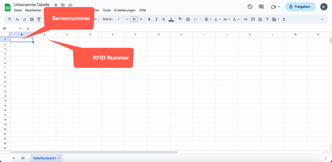 Auf der ersten Zeile muss jeweils ein Titel stehen und es braucht zwei Spalten. In der Spalte 1 kannst du "Nummer" schreiben und in der Spalte 2 "RFID".