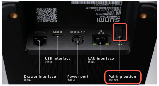 - Halte die Pairing-Taste bei den Anschlüssen für 2-3 Sekunden gedrückt, dann loslassen. Der Drucker sagt nun "find device"